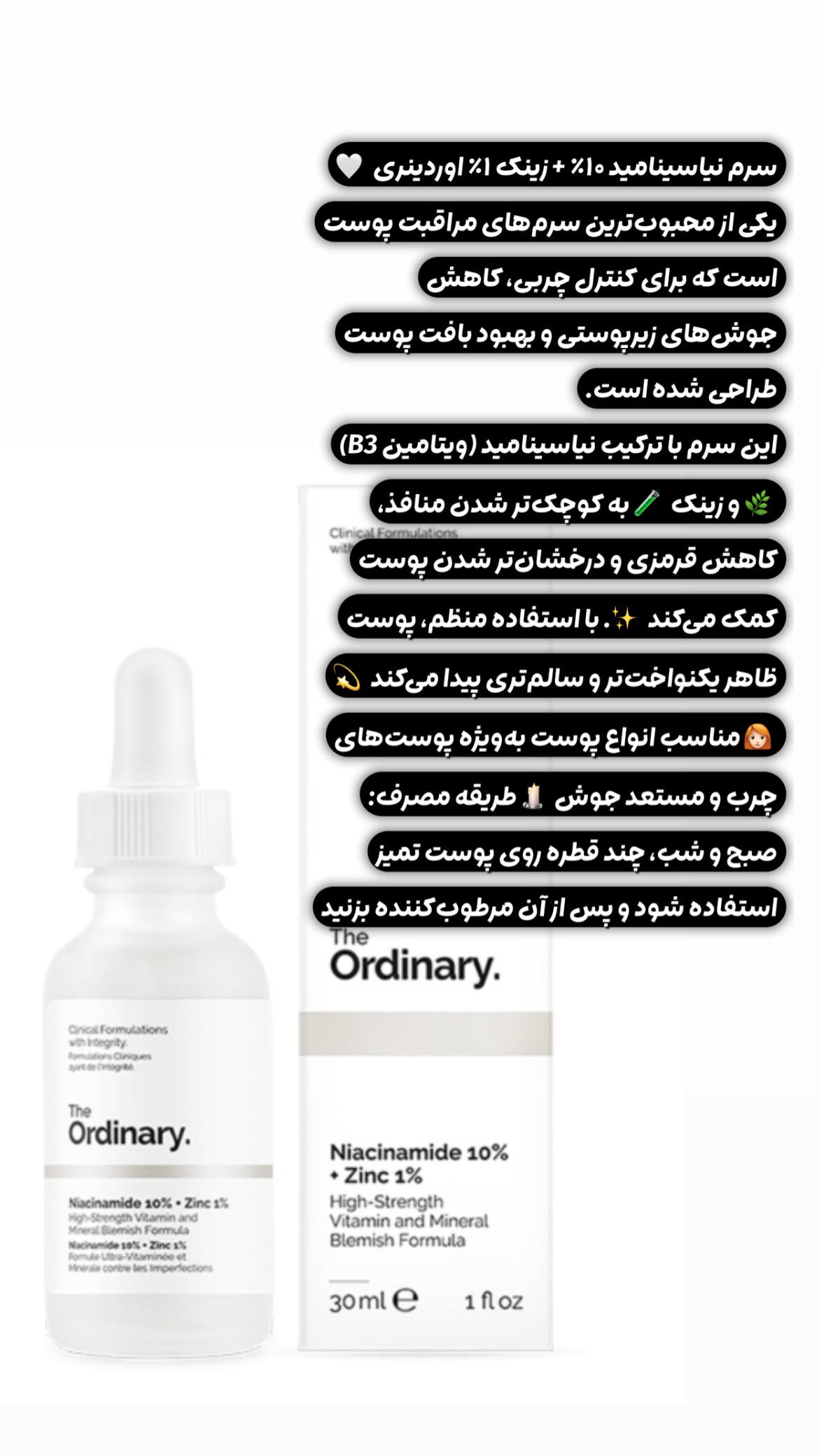 سرم نیاسینامید ۱۰٪ + زینک ۱٪ اوردینری 🤍 یکی از محبوبترین سرمهای مراقبت پوست است که برای کنترل چربی، کاهش جوشهای زیرپوستی و بهبود بافت پوست طراحی شده است.