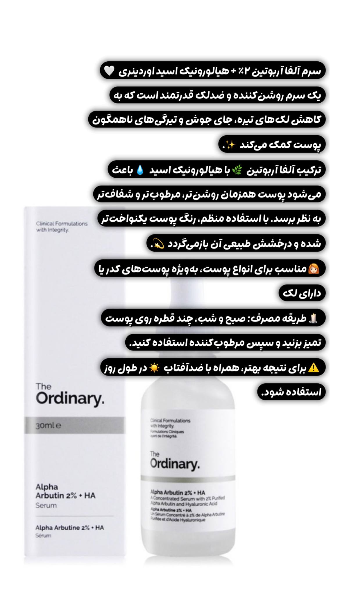 سرم آلفا آربوتین ۲٪ + هیالورونیک اسید اوردینری 🤍 یک سرم روشنکننده و ضدلک قدرتمند است که به کاهش لکهای تیره، جای جوش و تیرگیهای ناهمگون پوست کمک میکند ✨.